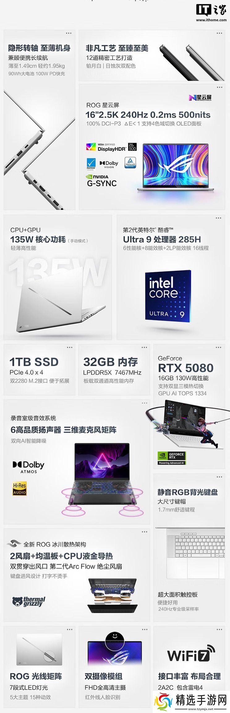 这款笔记本可选铂月白 / 日蚀灰两种配色,笔记本使用航空铝一体化机身,A 面配备ROG光显矩阵灯效,整体重量1.95千克,厚度1.49厘米,内置6扬声器,配备90Wh电池,支持100W PD快充。