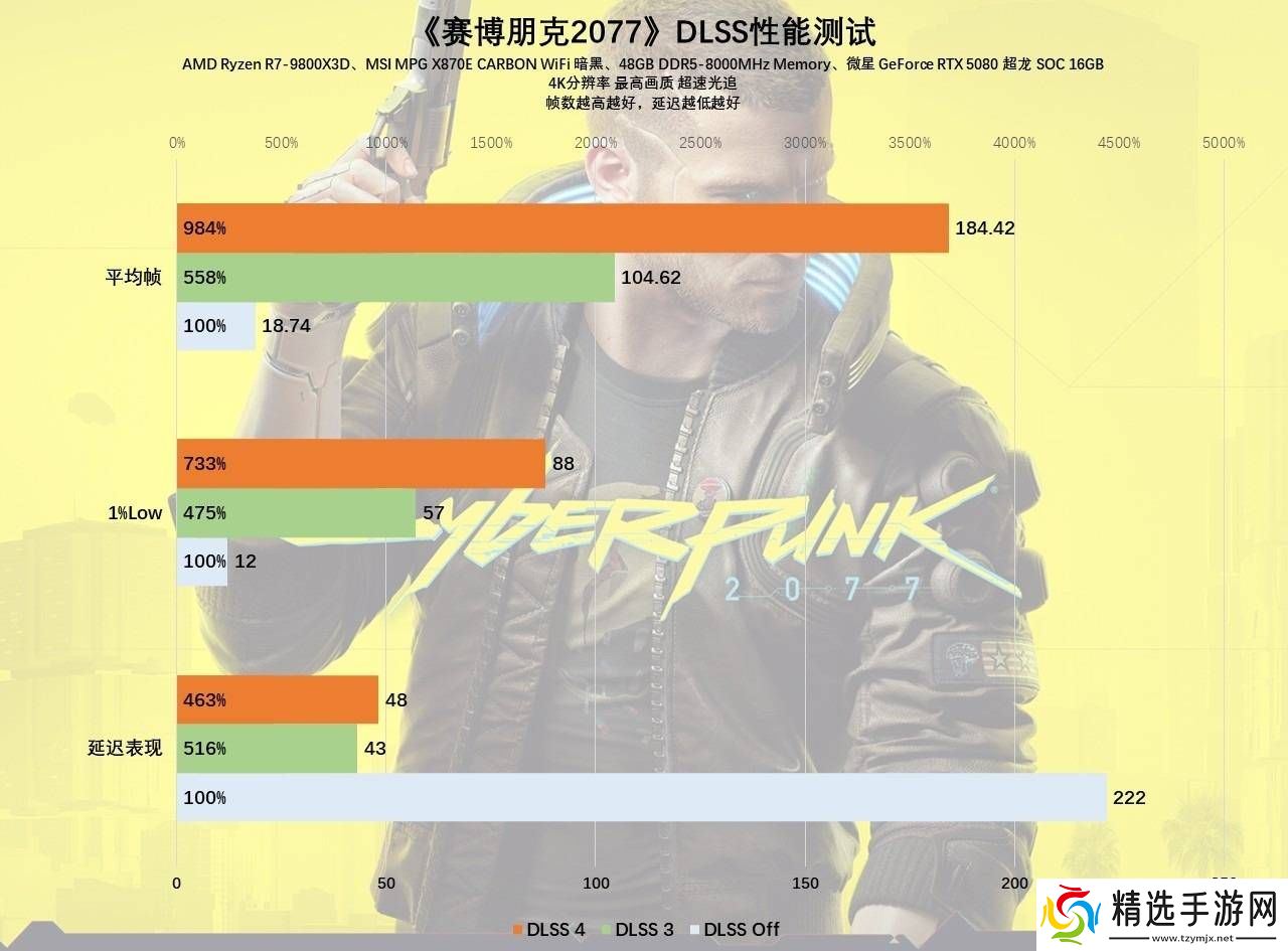 在实际游戏测试中,微星GeForce RTX 5080超龙SOC显卡同样表现出色。在《赛博朋克2077》中,开启DLSS 4后,游戏帧数从18.74 FPS提升至184.42 FPS,性能提升8.8倍。在《霍格沃兹之遗》中,开启DLSS 4后,游戏帧数从78 FPS提升至358 FPS,性能提升约4.5倍。