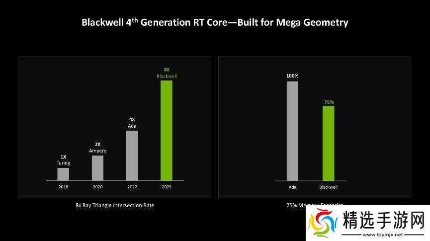 Blackwell架构是NVIDIA近年来更新幅度最大的GPU架构之一,它引入了神经网络着色器,为游戏带来了先进、高效且逼真的渲染方式。相比前代Ada架构,Blackwell架构在AI算力、光线追踪技术、显存能效以及神经网络渲染方面均实现了显著提升。