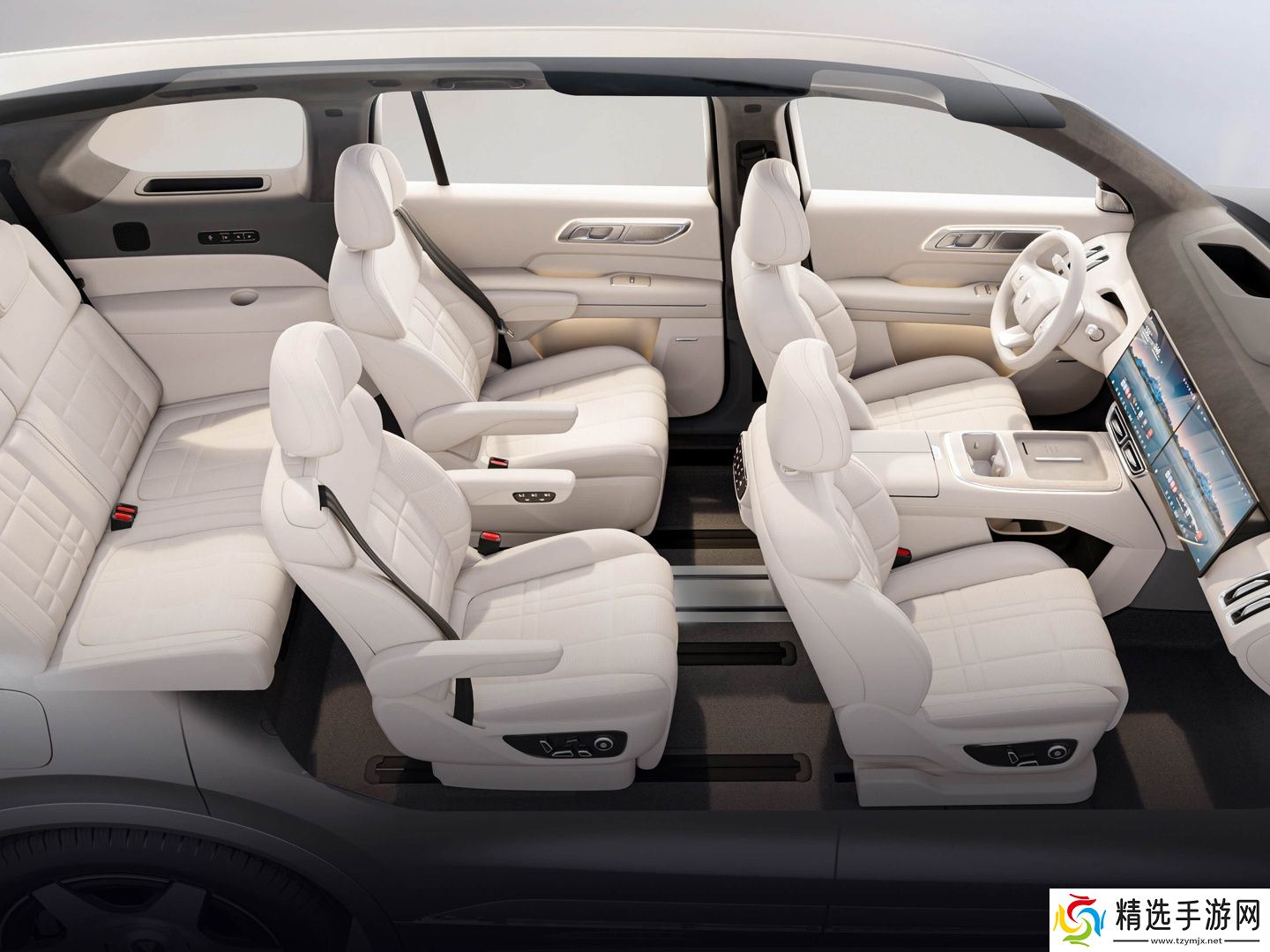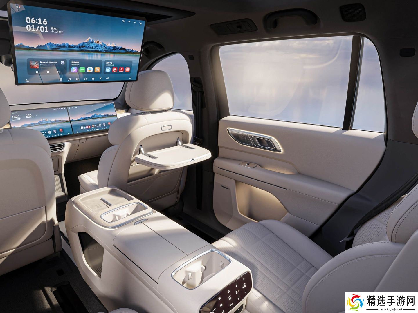 中排配备“行业唯一可横滑”双零重力按摩座椅 + 21.4 英寸高清娱乐屏。中排座椅支持 180mm 双横滑、一体式云感腿托、8 点式凸点按摩、通风、加热。此外,该车还配备 21.4 英寸、3K、16:9 比例、0-75° 电动可调后排娱乐屏。该车配备一体式智能移动中岛,翻盖式冰箱-6 至 50℃随心调。