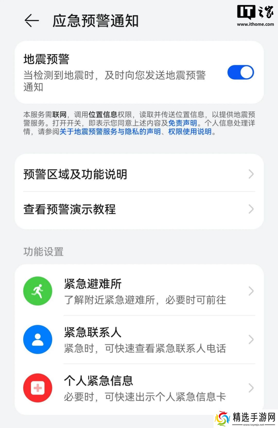 荣耀:设置- 安全 -应急预警通知 - 地震预警;