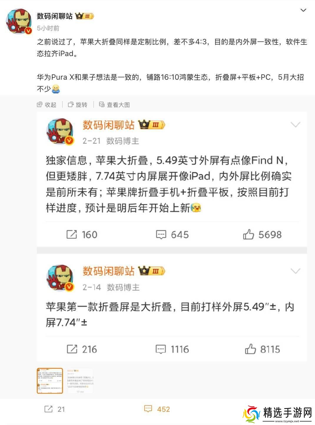 博主还回顾了自己先前的爆料,进一步确认了这款大折叠屏iPhone的详细规格。据悉,该机的外屏尺寸将达到5.49英寸,这一设计与某些现有的折叠屏手机,如Find N,有着异曲同工之妙。而其内屏尺寸更是惊人,达到了7.74英寸,为用户提供了更为广阔的视觉体验。