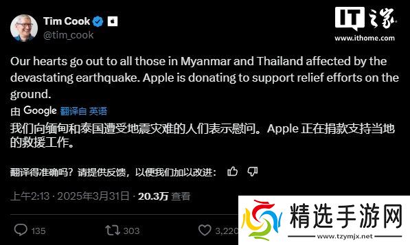 本站注意到,库克在社交媒体上发文表示:“我们的心与缅甸和泰国所有受这场毁灭性地震影响的人们同在。”