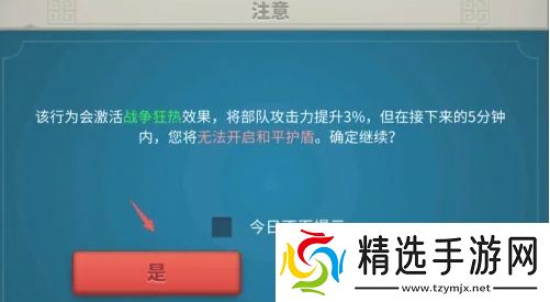 3、点击攻击后,产生【该行为会激活战争狂热效果,将部队攻击力提升3%,但在接下来的5分钟内,您将无法开启和平护盾。确定继续?】提示弹窗,点击是;
