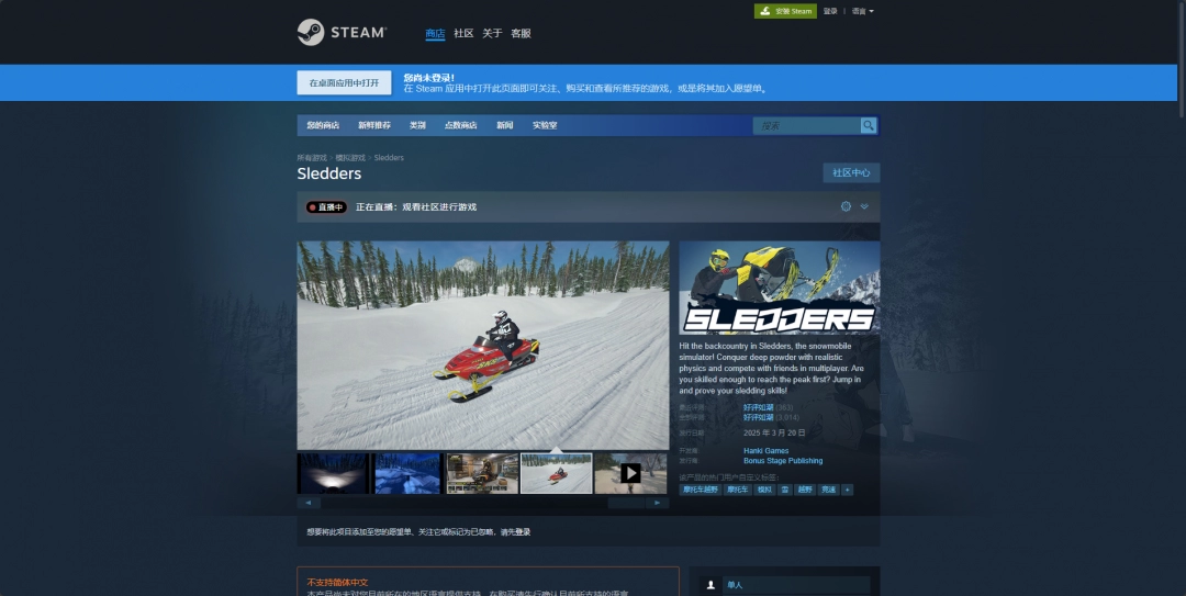 Steam平台需要先安装Steam平台,之后注册一个账号登录,然后搜索“Sledders”进入商店购买页面。