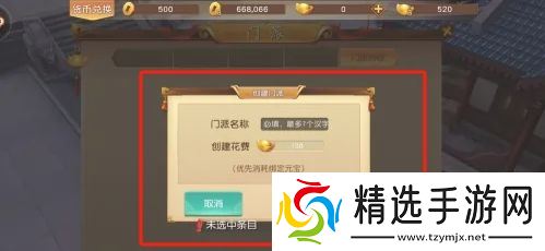 3、接着在创建页面,输入门派名称、花费100个元宝点击确定;