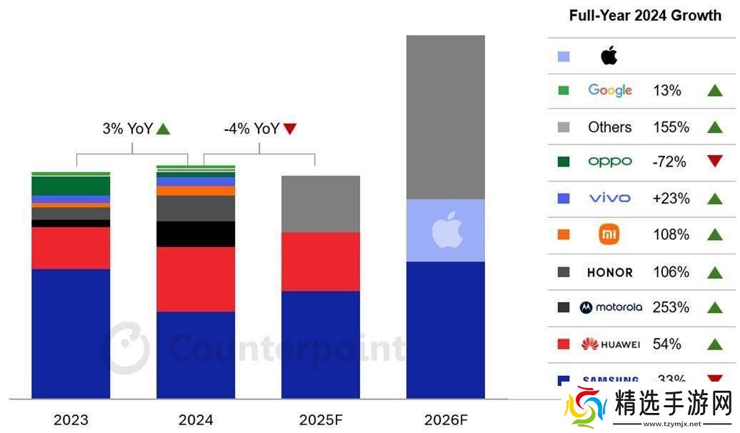 值得注意的是,CounterPoint Research在报告中特别提到了苹果和翻盖机型的回归。据其预测,随着苹果加入折叠屏手机市场的竞争以及翻盖机型的重新流行,2026年市场有望实现两位数增长。这一预测为市场带来了新的期待。