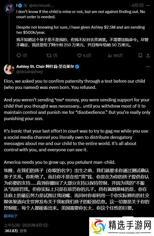 本站 4 月 2 日消息,近日,特斯拉公司创始人埃隆・马斯克与网红阿什利・斯蒂・克莱尔之间的纠纷持续发酵。这场争端始于 2 月 14 日,当时克莱尔声称自己为马斯克生下了第十三个孩子,但马斯克拒绝承认该孩子是自己的亲生子女。克莱尔称已经聘请了律师起诉埃隆・马斯克,法院命令他进行亲子鉴定。