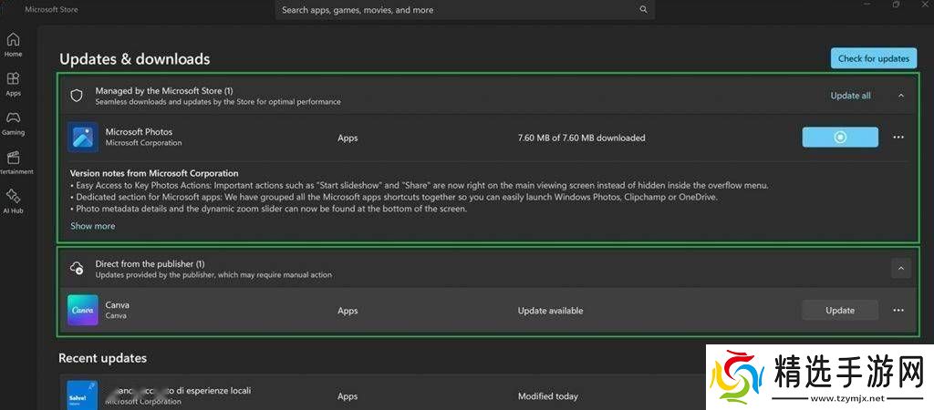微软还对下载页面进行了细致的优化。新版本中,应用分类更加清晰,同时新增了两类更新信息的展示:一类是由Microsoft管理的应用程序更新,这类更新将自动应用;另一类则是由发布商管理的应用程序更新,用户可以根据需要单独更新每个应用程序。这样的设计不仅简化了应用管理流程,还赋予了用户更高的灵活性和效率。