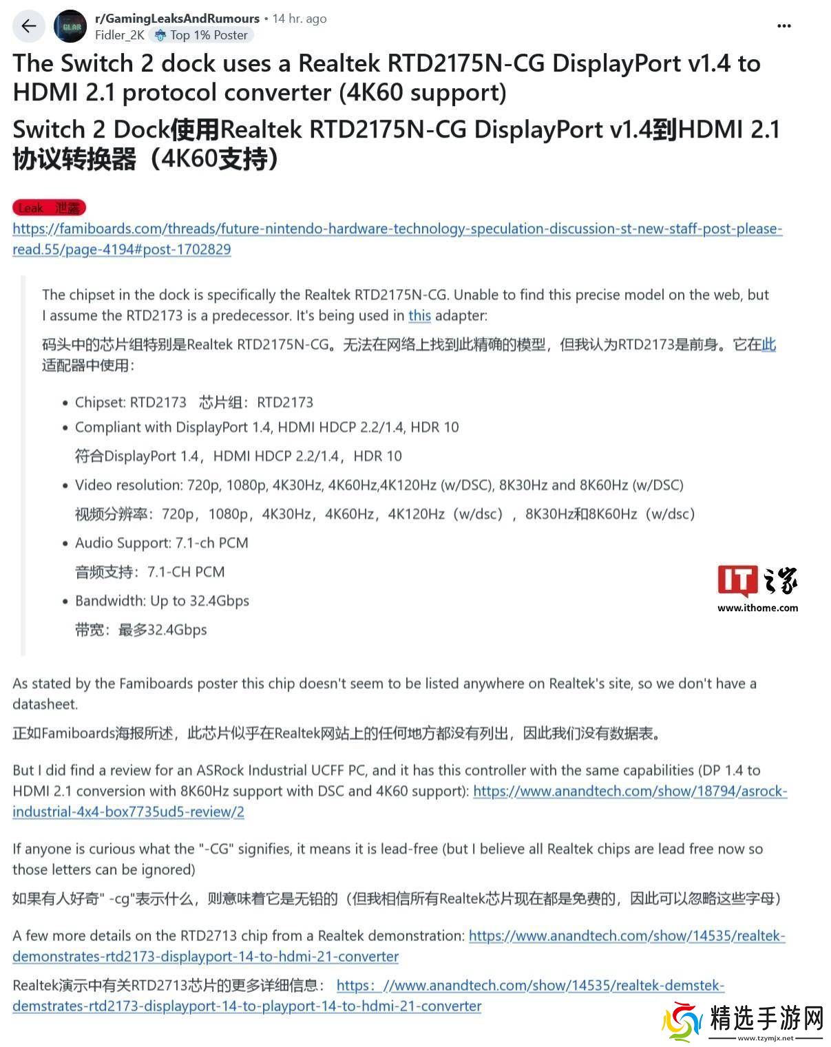近日,任天堂Switch 2的硬件细节再次成为游戏玩家关注的焦点。据Famiboards论坛用户最新爆料,Switch 2新款底座内置了Realtek RTD2175N-CG芯片,这一改变或将为玩家带来前所未有的视觉体验。