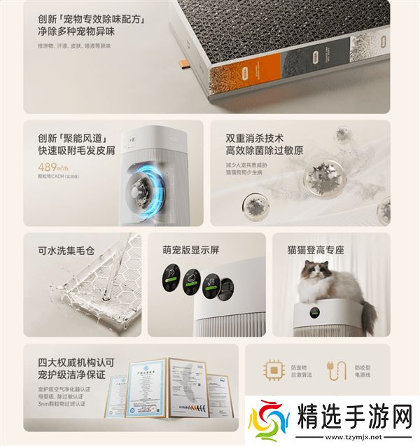 米家宠物空气净化器采用了三重改性活性炭配方,通过一系列化学反应,包括氨基酸分解、酸碱中和以及金属离子络合,实现了对宠物口腔、汗液及**物等异味的深度去除。这一创新技术使得该净化器获得了中家院颁发的“宠护级”净化认证。