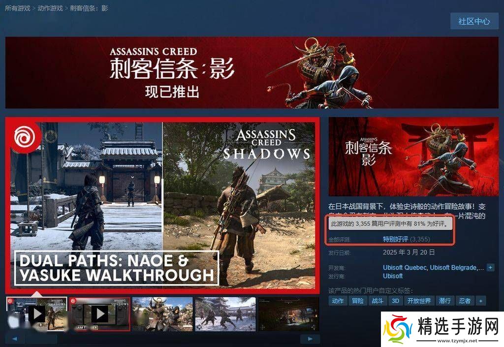 从Steam页面上的玩家评论来看,《刺客信条:影》同样获得了不俗的口碑。截至目前,游戏已收获3355条评论,其中好评率高达81%,综合评价为“特别好评”。玩家们对游戏的精美画面、丰富内容以及震撼人心的世界设定给予了高度评价,同时也对游戏在剧情和任务设计上的表现表示了认可。