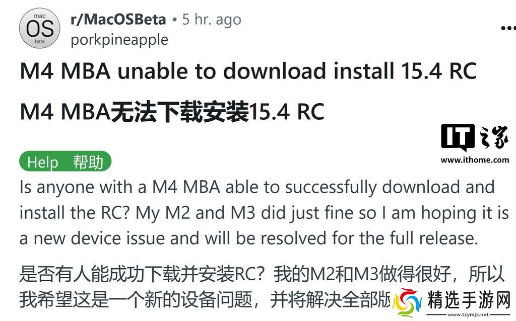 本站 3 月 25 日消息,科技媒体 MacRumors 今天(3 月 25 日)发布博文,报道称 M4 MacBook Air 以及 M4 Max / M3 Ultra 芯片的 Mac Studio 无法安装 macOS 15.4 RC 版本。