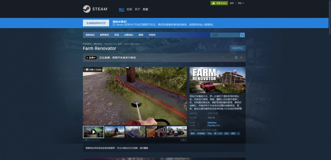 《农场翻修者》是由MobilWay制作、PlayWay S.A.发行的农场模拟游戏,而这款游戏的官网地址就是Steam平台的购买页面,进入到这个游戏的购买页面基本上就能知道所有这款游戏的信息。
