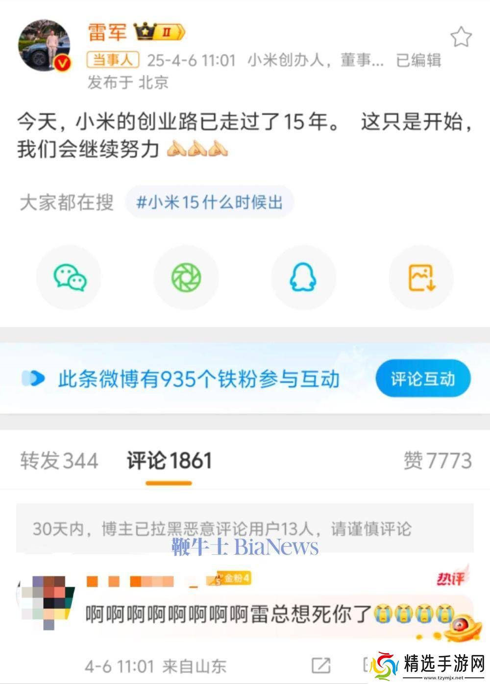 在小米公司迎来其创立15周年的重要时刻,小米科技有限责任公司的创始人兼董事长雷军,于4月6日在个人微博上发表了一则感言。