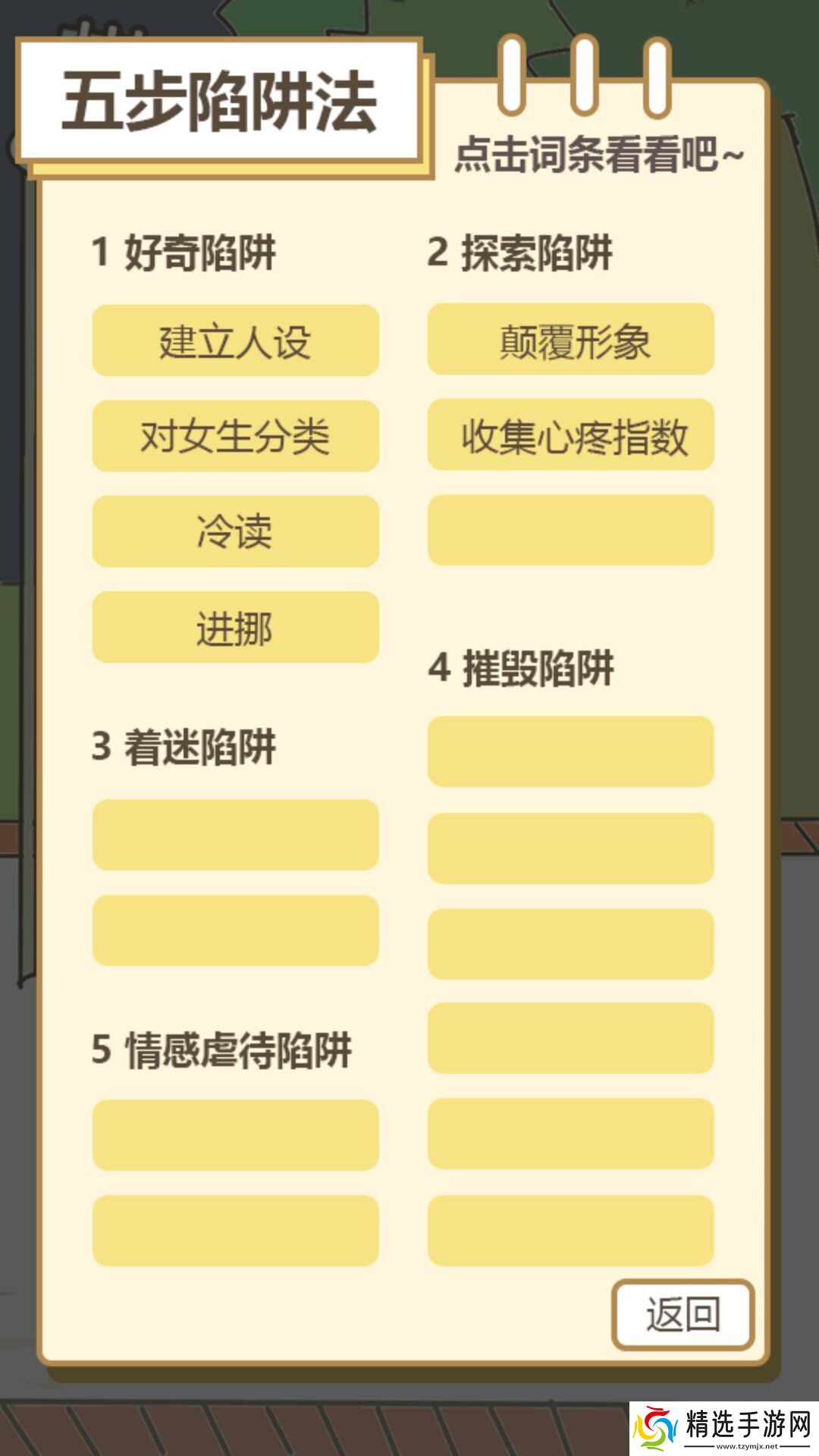 游戏中有很多关键的词条,留意这些词条,然后进行推理,寻找渣男的证据。