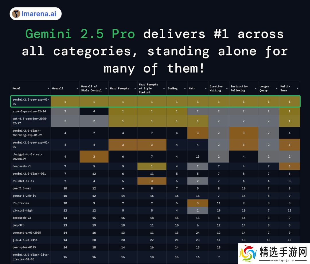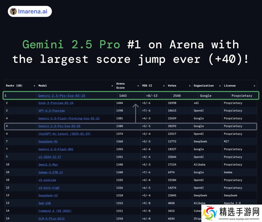 现在,Gemini 2.5 Pro 已经登顶了 Arena 排行榜的第一位,而且创下了历史最大分数飞跃,比 Grok-3 / GPT-4.5 整整高出了 40 分!