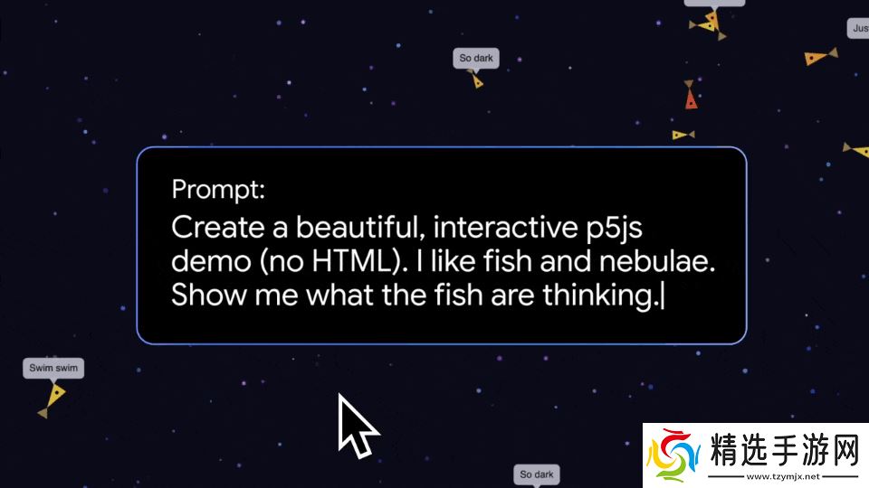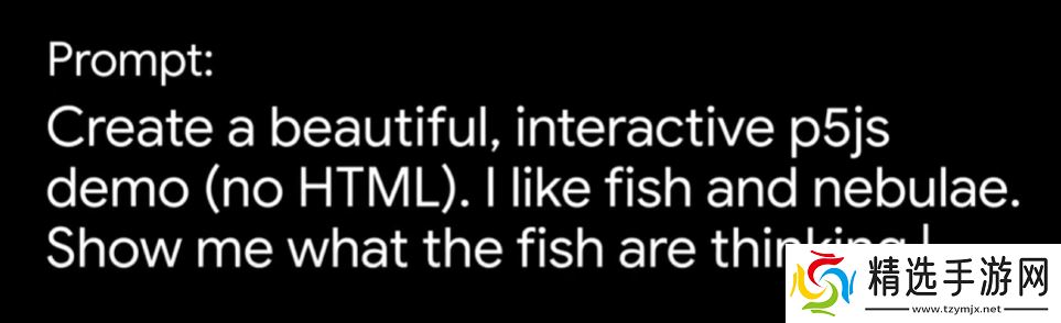 在下面这个 demo 中,仅仅根据下面这行 prompt,它就生成了一段 p5js 的交互式动画,展示了「宇宙鱼」的场景,并且还显示了鱼们都在想什么。