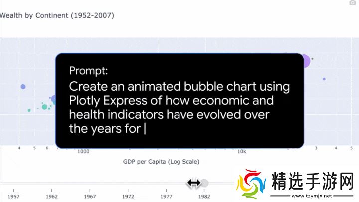 此外,它还能构建一个交互式气泡图,直观展示出了每个大陆的经济与健康指标随时间的变化。