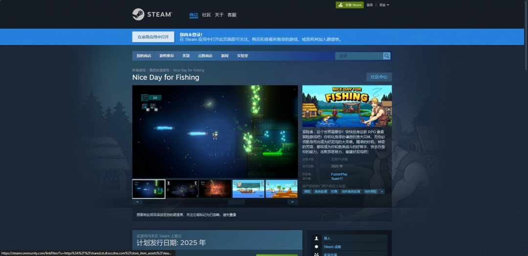 Steam平台需要先安装Steam平台,之后注册一个账号登录,然后搜索“Nice Day for Fishing”进入商店购买页面。