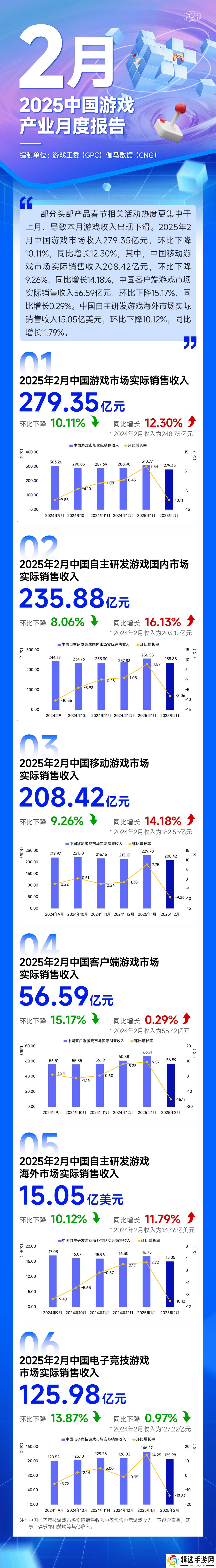 具体而言,2025年2月中国游戏市场的总收入达到了279.35亿元,与上月相比下降了10.11%,但与去年同期相比则增长了12.30%。其中,中国移动游戏市场表现尤为突出,尽管实际销售收入环比下降了9.26%,达到208.42亿元,但同比增长却高达14.18%。这一数据反映出移动游戏市场依旧保持着强劲的增长势头。