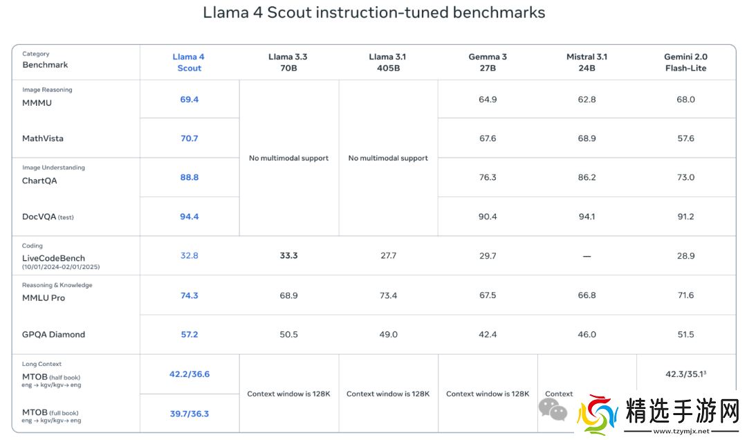 这一点主要体现在 Meta 公布的中杯 Llama 4 Scout 的详细数据里: