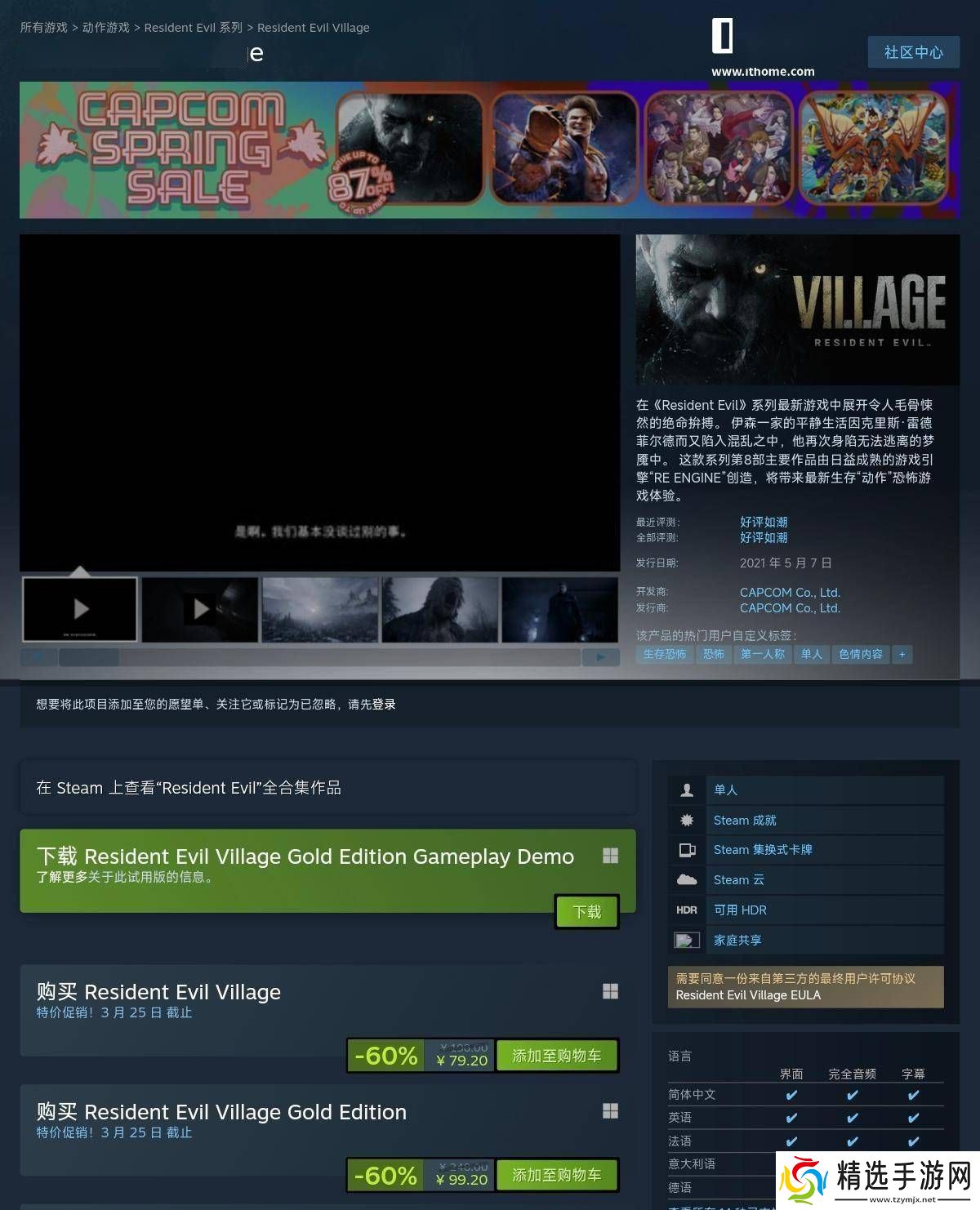 回顾《生化危机》系列,最新的正统作品《生化危**:村庄》于2021年5月7日发售,并成功登陆了PlayStation 4/5、Xbox One、Xbox Series X|S、Windows、iPhone、iPad及macOS等多个平台。这款游戏凭借其出色的表现,赢得了2021年度Steam游戏大奖、游戏大奖最佳演出以及金摇杆奖终极年度游戏等多项荣誉。目前,在Steam国区,《生化危**:村庄》正在进行限时4折促销,仅需79元人民币即可购买,原价为198元人民币,这一价格已经接近历史最低价。
