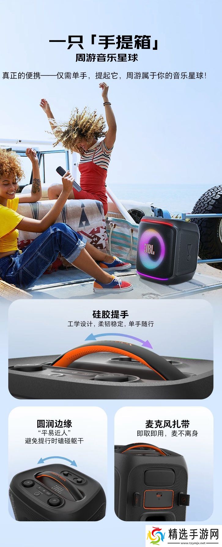 外观方面,这款音箱拥有24色可调节拍灯,支持根据歌曲匹配灯效,增加动感效果。音箱配备硅胶提手,号称“单手即可拎起”。