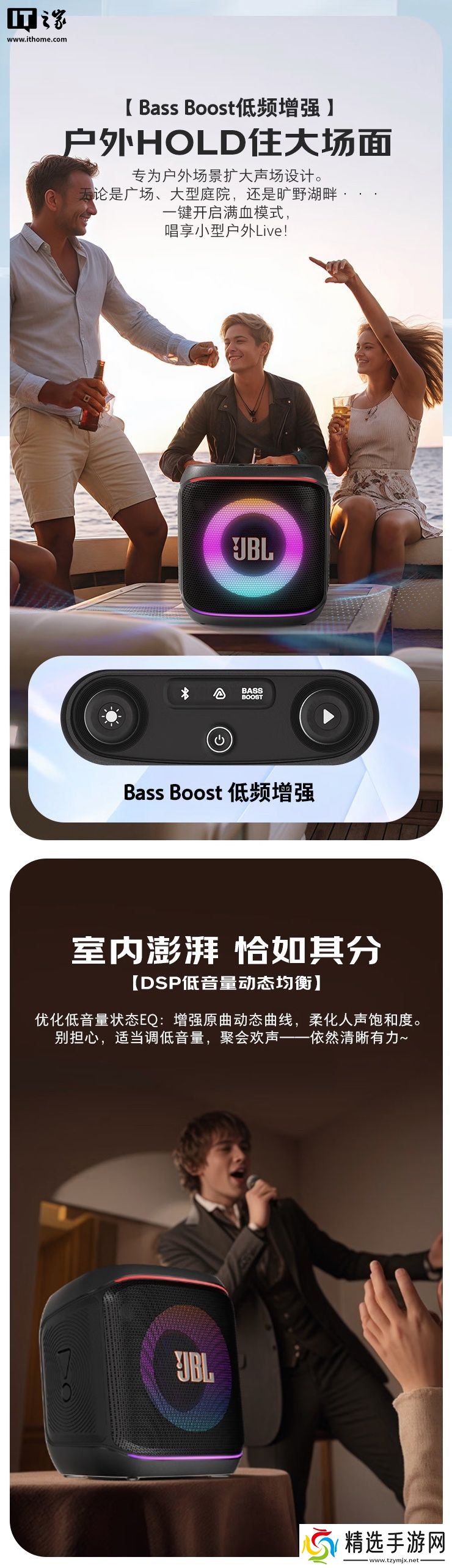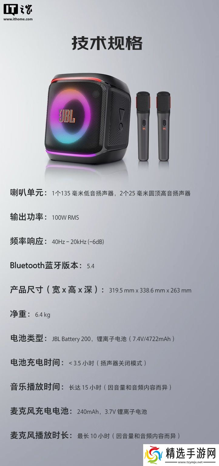此外,这款音箱拥有IPX4防水等级,支持通过App调参,音箱内置蓝牙5.4技术,支持双设备组建立体声,音箱内置 4722 毫安时电池,续航至高15小时。