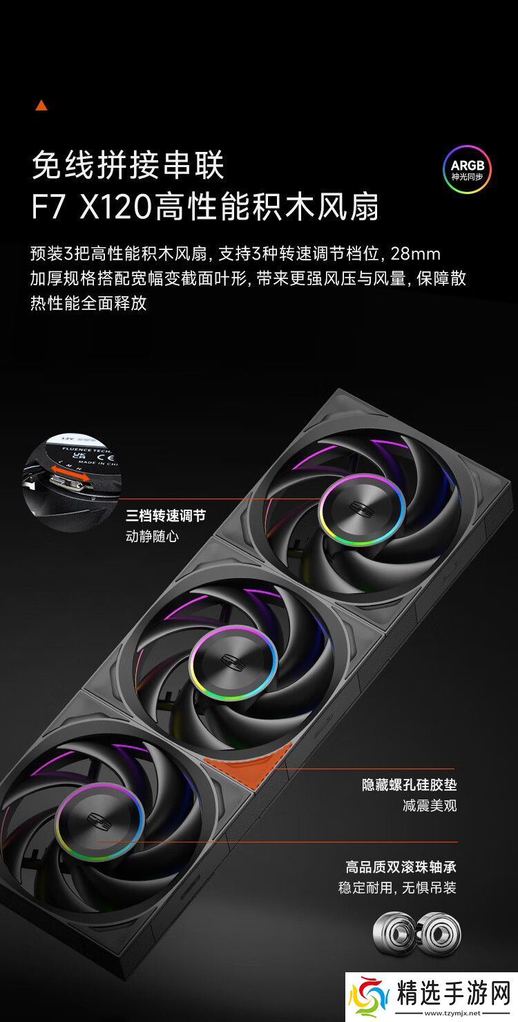 此外其标配三颗光翼 F7 X120 风扇,各扇体间采用积木拼接 + 卡扣固定的免线串联结构。该风扇采用 12028 加厚规格,搭载双滚珠轴承,支持三档转速调节(3000 / 2200 / 1500 RPM)。