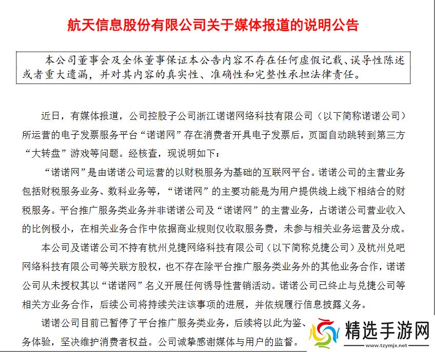 近期,航天信息发布了一则关于其控股子公司浙江诺诺网络科技有限公司(简称诺诺公司)运营的电子发票服务平台“诺诺网”的公告,回应了有关该平台用户开具电子发票后遭遇页面跳转至第三方“大转盘”游戏等问题的媒体报道。