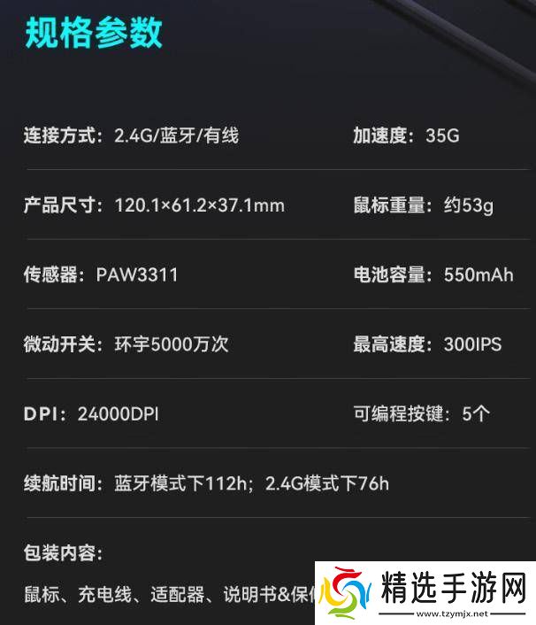 这款鼠标在设计上注重轻量化,重量仅为约53克,使得用户在长时间使用下也能保持舒适的手感。同时,G1M鼠标搭载了高端的原相PAW3311传感器芯片,支持超频至24000DPI,以及300 IPS的追踪速度和35G的加速度,确保了精准的定位和快速的响应。