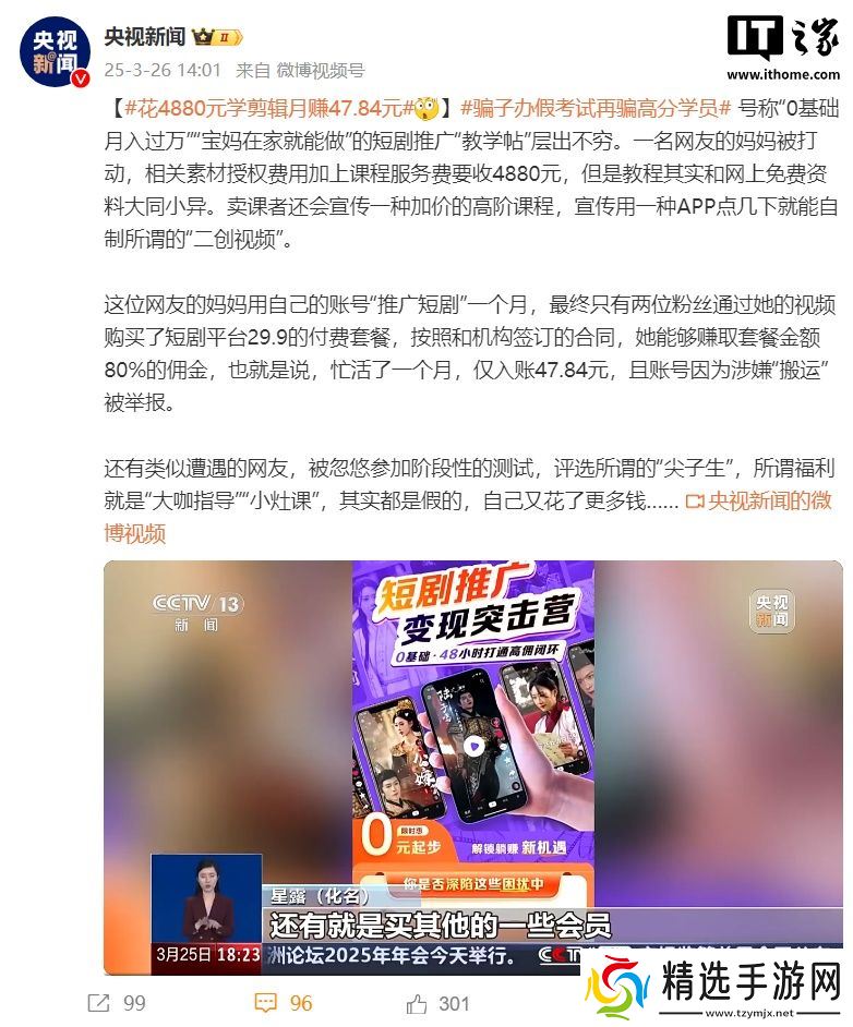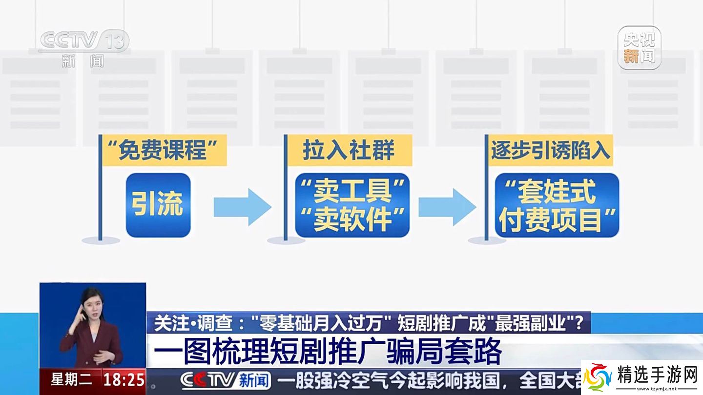 本站 3 月 26 日消息,央视新闻今日曝光短剧推广骗局套路,号称“0 基础月入过万”“宝妈在家就能做”的短剧推广“教学帖”层出不穷。