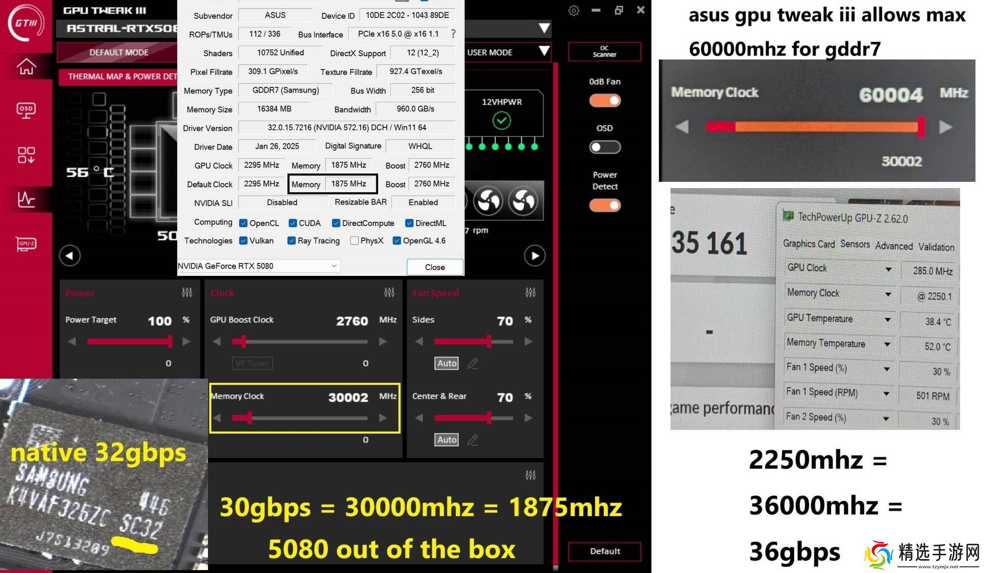 据了解,RTX 5080显卡所搭载的GDDR7显存,原本具备高达32GHz的原生频率,但实际运行中被设定在了30GHz(数据率为36Gbps),这一设定预示着其蕴含着巨大的超频潜力。此前,华硕的GPU Tweak II软件已经能够实现对GDDR7显存的超频操作,并将频率成功推高至36GHz,但这一功能仅限于华硕自家的显卡产品。