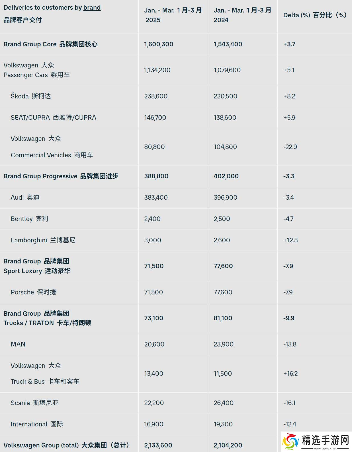 为了进一步细化数据,大众集团还公布了各品牌一季度的交付情况。具体数据显示,各品牌在不同市场中的表现各有千秋,有的品牌在某些市场中实现了显著增长,而在其他市场中则面临挑战。这些数据为大众集团提供了宝贵的市场洞察,有助于其未来制定更加精准的市场策略。