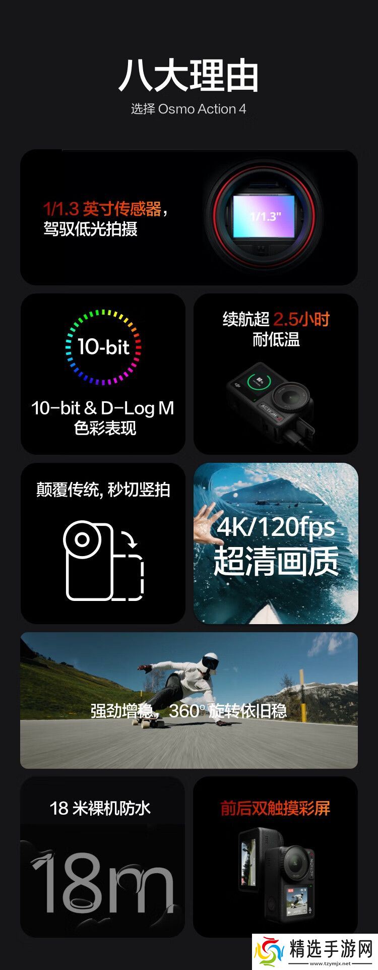 大疆 DJI Osmo Action 4运动相机于 2023 年 8 月发售,搭载1/1.3英寸图像传感器,等效像素尺寸2.4μm,配合f / 2.8光圈,用户可拍摄4K / 120fps、155º视角视频。