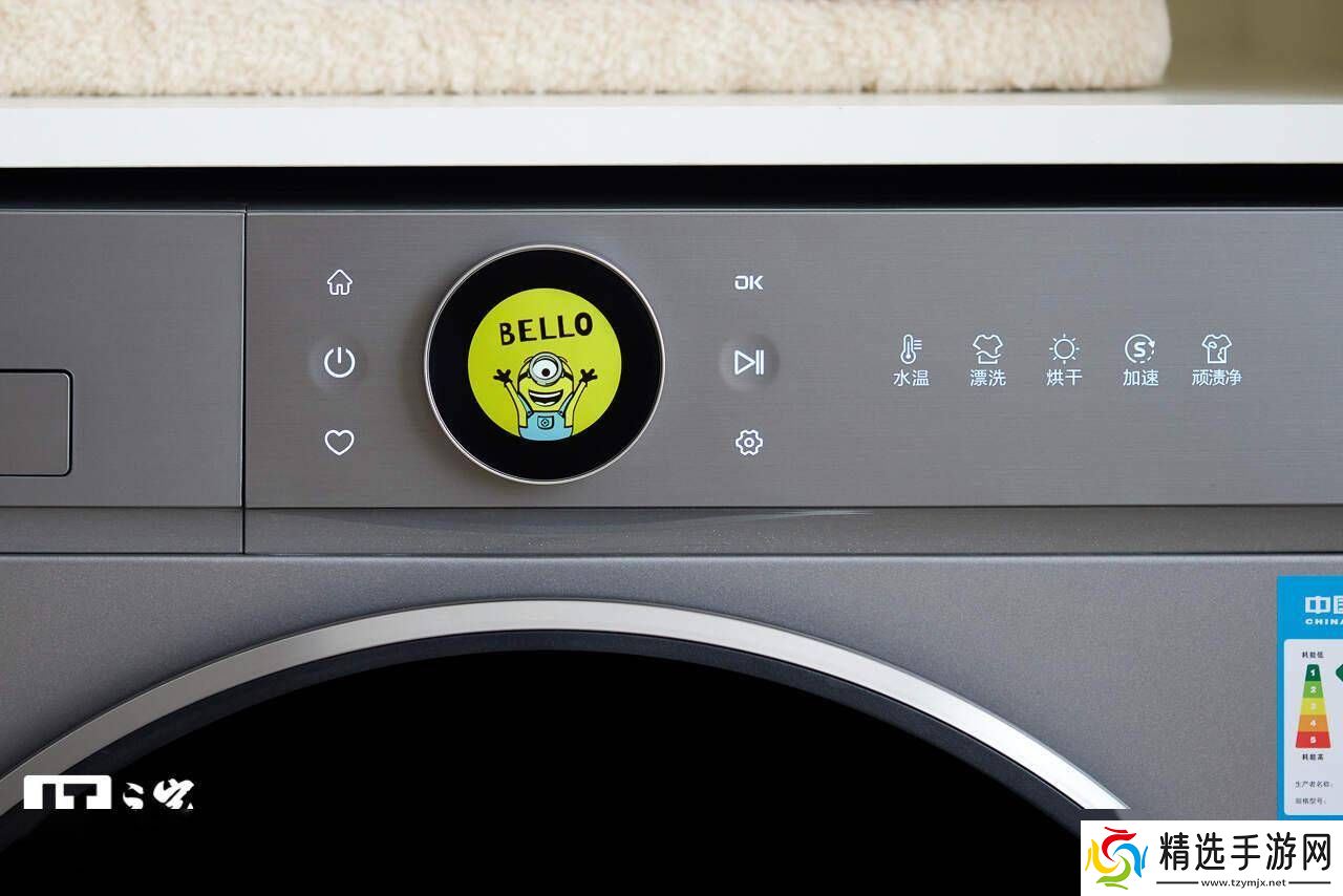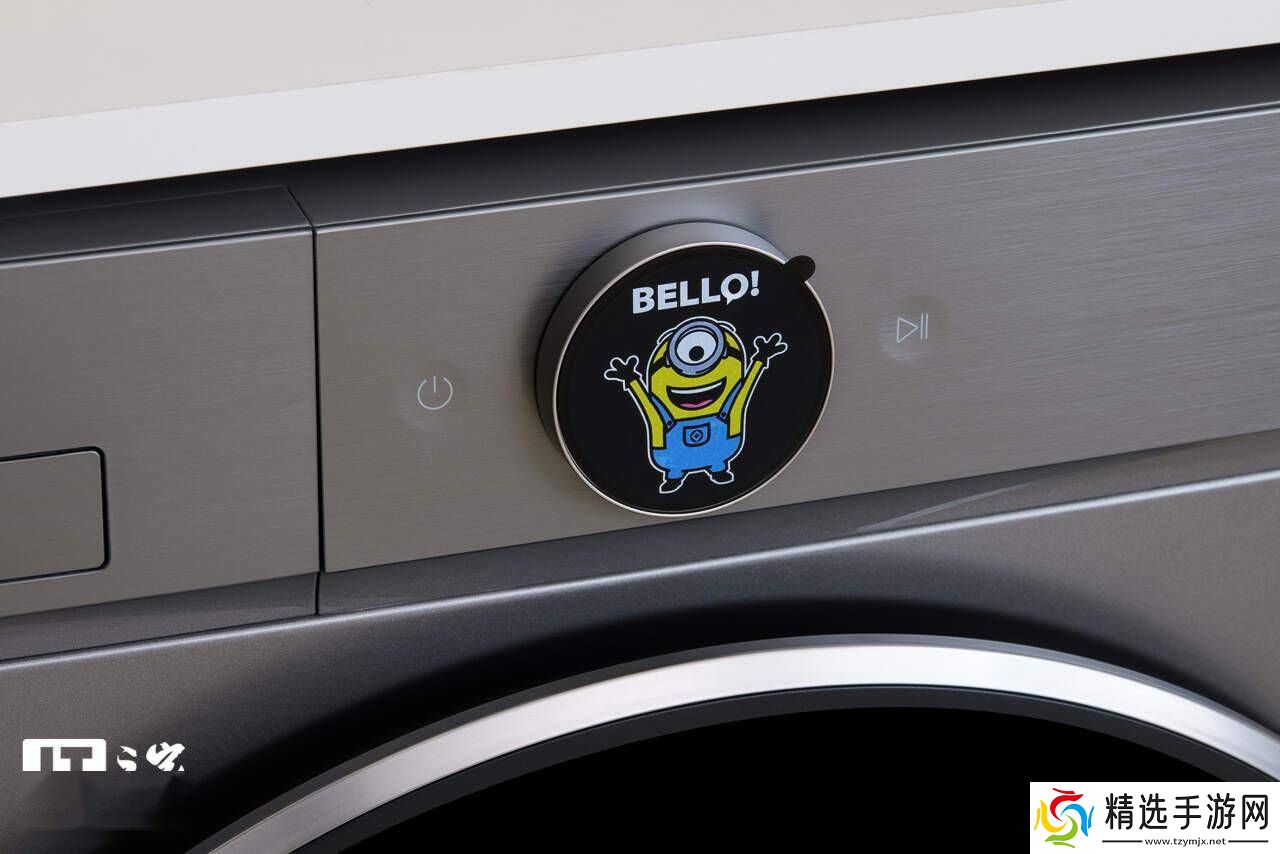 不仅如此,TCL T7R Pro还携手小黄人大眼萌,成为其官方合作伙伴,将小黄人的趣味元素巧妙融入产品设计中,为用户带来耳目一新的使用体验。从开箱的那一刻起,用户就能感受到小黄人的魅力——旋钮屏上贴有可爱的小黄人贴纸,开机时屏幕亮起的logo也是小黄人的形象,滚筒盖中央更是醒目地印有小黄人的标识。