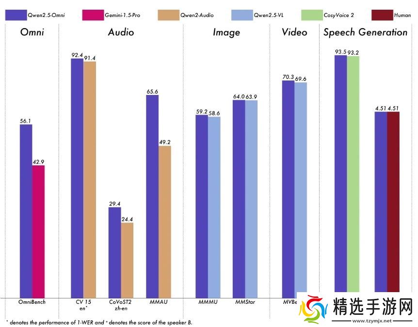 在多模态任务 OmniBench,Qwen2.5-Omni 达到了 SOTA 的表现。此外,在单模态任务中,Qwen2.5-Omni 在多个领域中表现优异,包括语音识别(Common Voice)、翻译(CoVoST2)、音频理解(MMAU)、图像推理(MMMU、MMStar)、视频理解(MVBench)以及语音生成(Seed-tts-eval 和主观自然听感)。