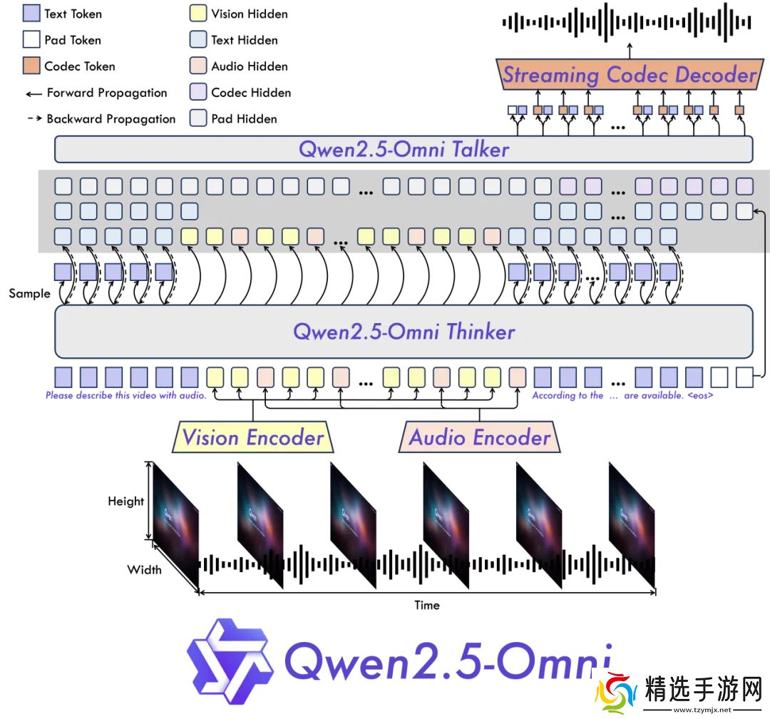 全能创新架构:Qwen 团队提出了一种全新的 Thinker-Talker 架构,这是一种端到端的多模态模型,旨在支持文本 / 图像 / 音频 / 视频的跨模态理解,同时以流式方式生成文本和自然语音响应。Qwen 提出了一种新的位置编码技术,称为 TMRoPE(Time-aligned Multimodal RoPE),通过时间轴对齐实现视频与音频输入的精准同步。
