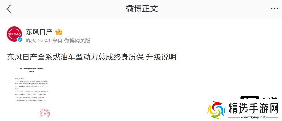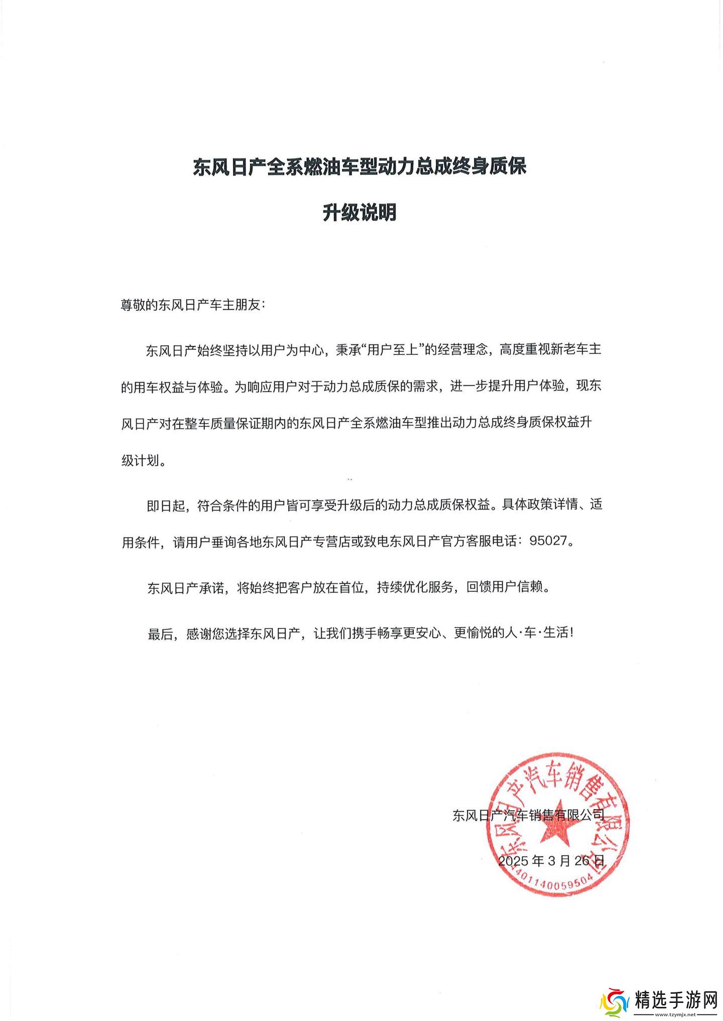 本站 3 月 27 日消息,东风日产官方微博昨日晚发布升级说明,宣布东风日产全系燃油车型动力总成升级终身质保。