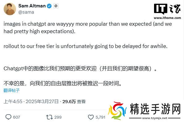 本站 3 月 27 日消息,OpenAI 首席执行官萨姆奥尔特曼(Sam Altman)今天在 X 上承认,ChatGPT 中图像生成工具的受欢迎程度远超预期,所以免费版用户的上线计划将不得不推迟一段时间。