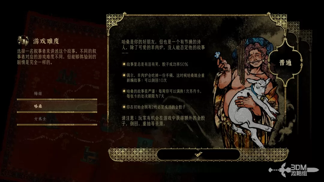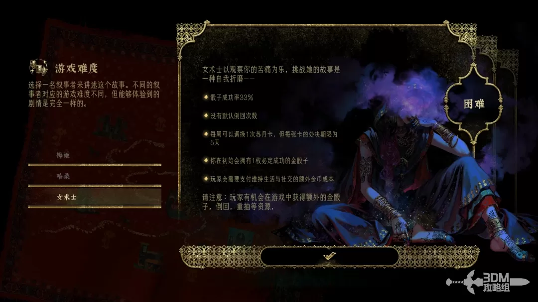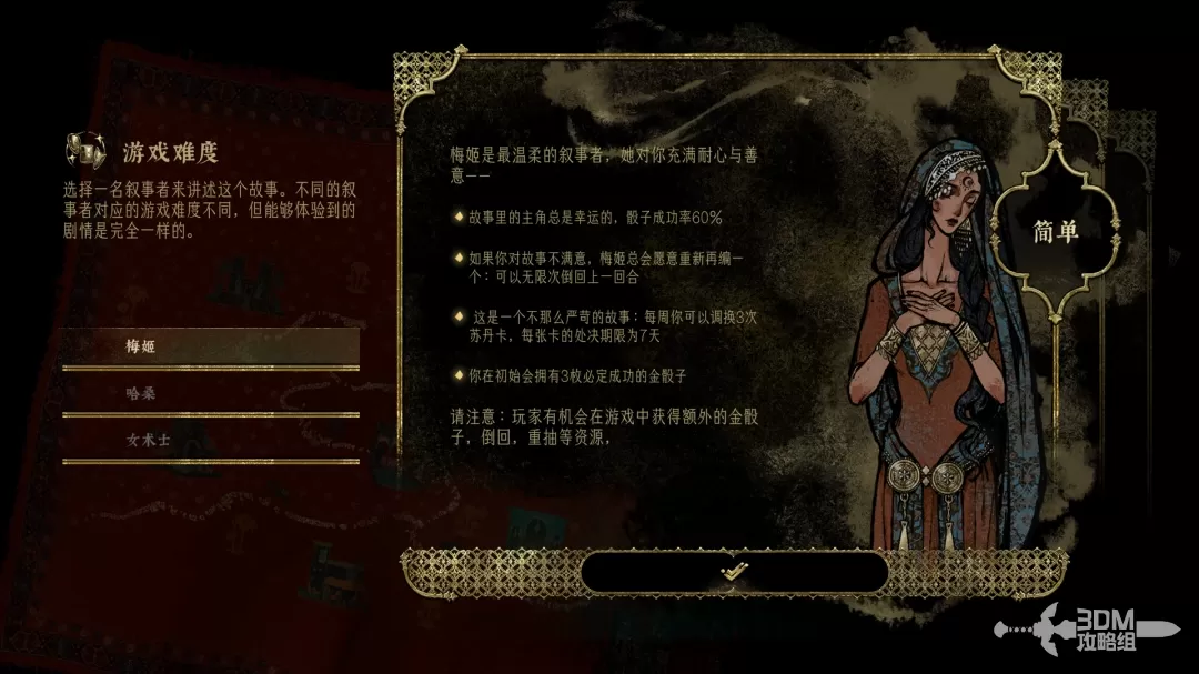 在游戏的开始总共有三个难度可供玩家选择,讲述者梅姬对应的是简单难度。