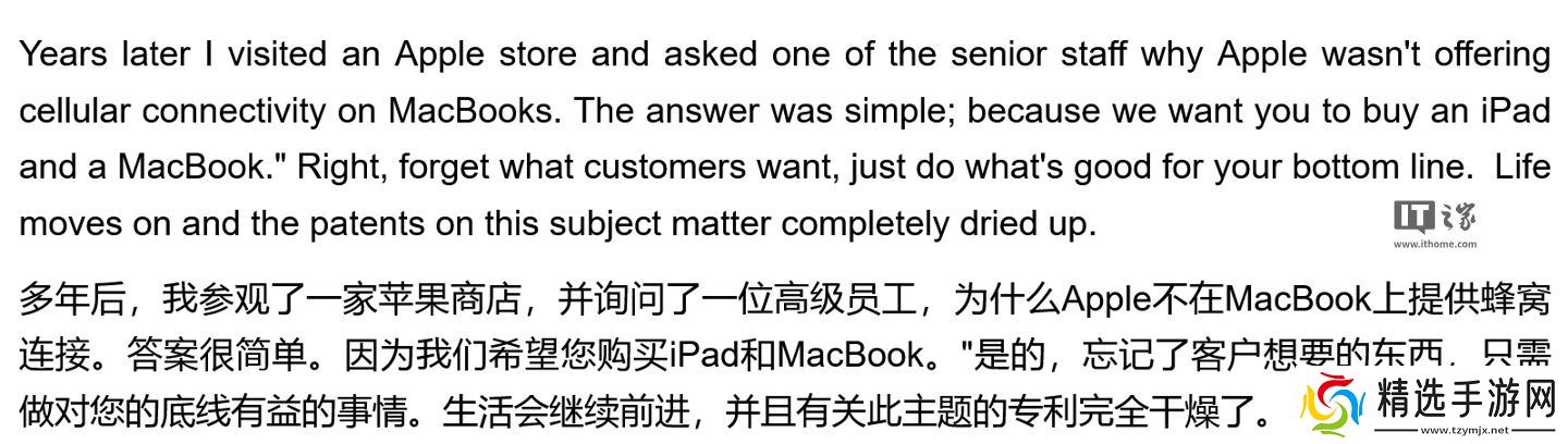 那么苹果为何搁置蜂窝网络版 MacBook 呢?该媒体在博文中表示多年前,带着这个疑问前往 Apple Store,得到的回复是:“希望用户同时购买 iPad 和 MacBook”。