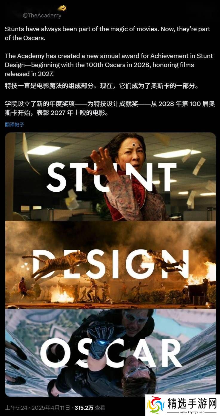 这一历史性的决定通过学院官方社交媒体平台公布,同时配发了三部知名电影的图片,包括2022年的《瞬息全宇宙》和《RRR》,以及2011年的《碟中谍4》。然而,这三部作品均无缘这一新设立的奖项,因为首届最佳特技设计奖将授予2027年上映的电影。