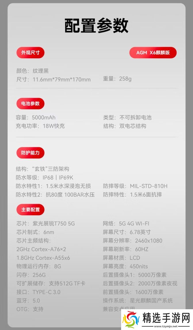 据介绍,AGM X6 三防手机麒麟版采用“玄铁”架构,边角为外层吸能结构,同时支持 IP68、IP69K 防护特性,号称“接口裸露防水”。新机还通过 MIL-STD-810H军规测试,支持一次免费进水保修和碎屏保修。