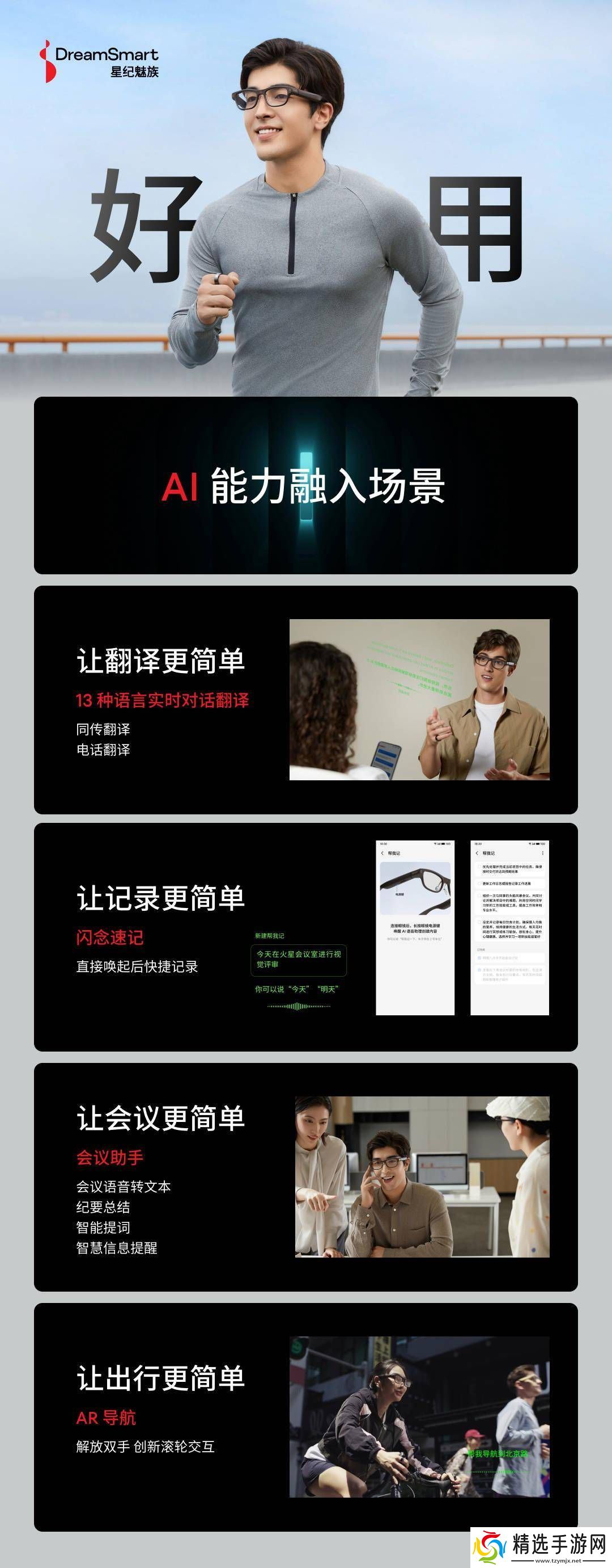 在技术方面,StarV Air2搭载了星纪魅族自研的StarVision显像系统,采用了超小体积的单绿光引擎,支持高达2000nit的高亮显示。这一技术突破使得用户在户外强光环境下也能清晰看到显示内容。StarV Air2还采用了滚轮交互方式,操作简便快捷。在功能方面,这款智能眼镜不仅支持实时翻译,还具备闪念速记、会议助手、AR导航等多种实用功能,为用户的工作和生活带来了极大的便利。