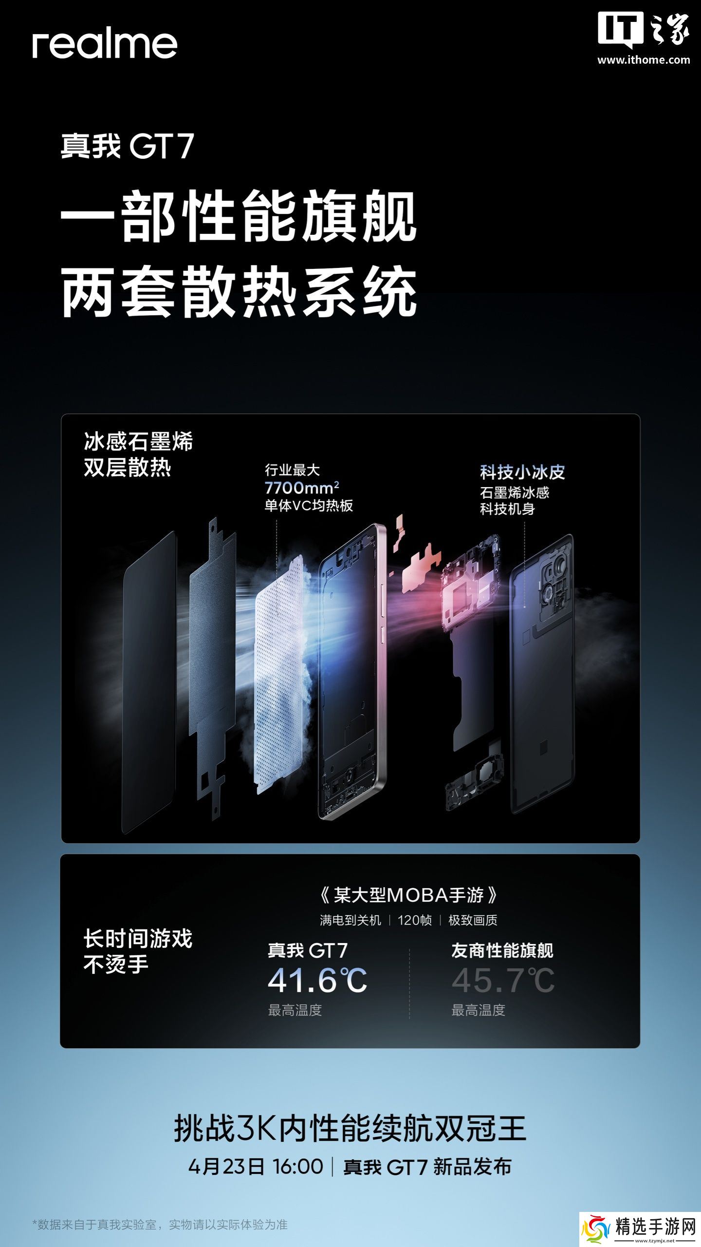 本站注意到,真我 realme 副总裁、全球营销总裁、中国区总裁徐起已开启新机预热:真我 GT7 手机的全新 GT 性能引擎 2.0 搭载芯片级内核技术,可无限稳帧、不挑游戏;该机还配备行业最大 7700mm² 单 VC 均热板 + 行业首发冰感石墨烯。