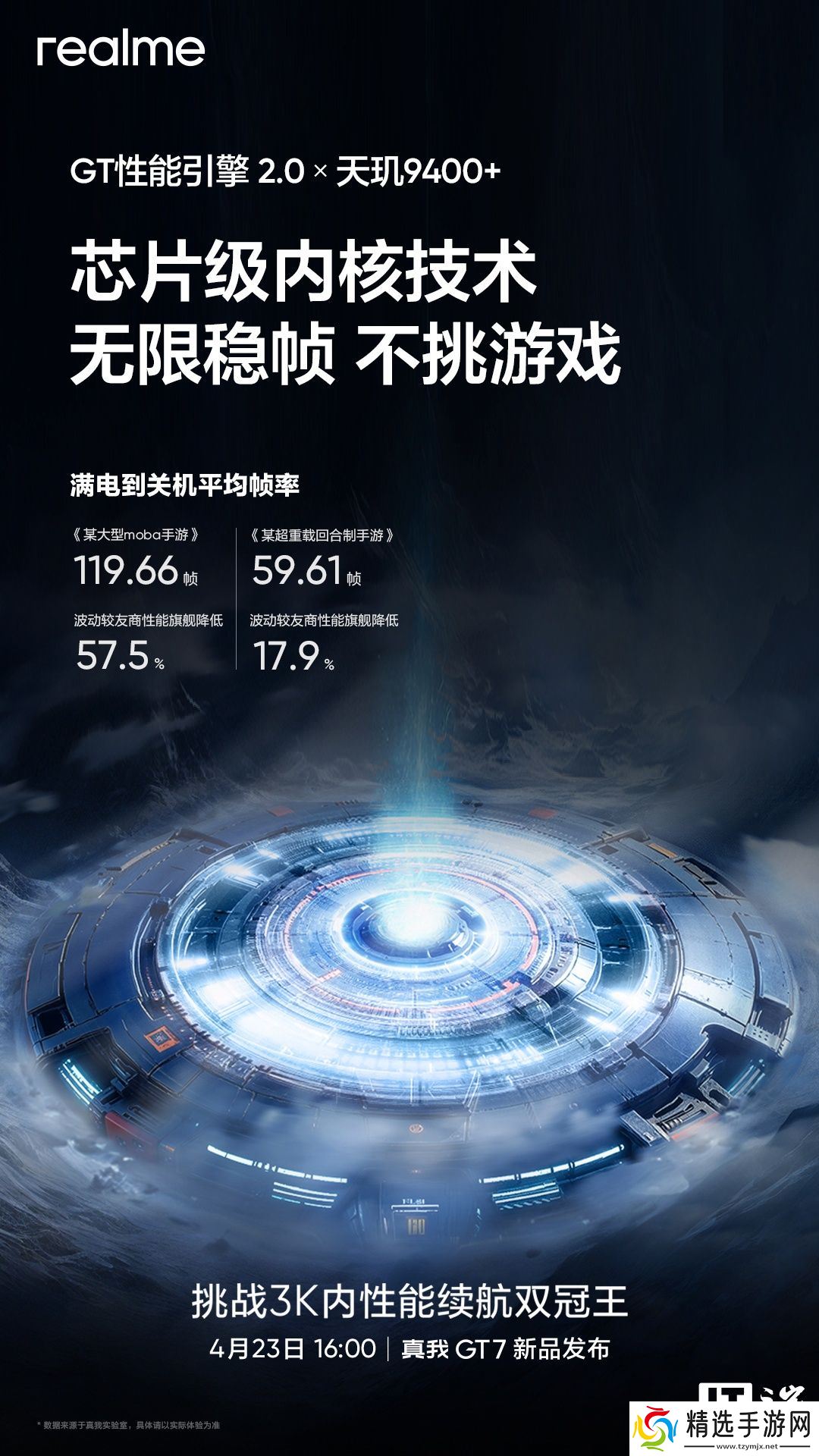 本站 4 月 13 日消息,realme 真我手机官微本月(4 月 11 日)宣布,首款天玑 9400 + 性能旗舰机型真我 GT7 将于 4 月 23 日 16 时正式发布,将要挑战 3000 元以内的性能、续航“双冠王”。
