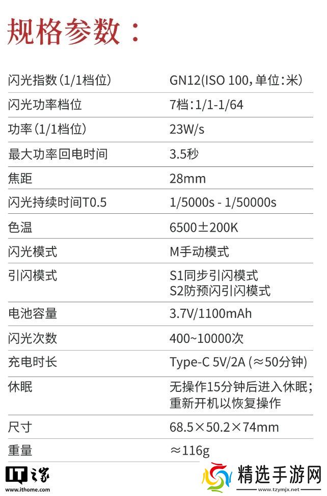 在参数方面,该闪光灯闪光指数 GN12,内置 7 档亮度模式,从 1/64-1/1,回电速度 0.2 秒-3.5 秒,闪光持续时间(T 0.5)1/5000 秒-1/50000 秒;内置两种光引闪模式,S1 模式可实现无线离机触发闪光灯,S2 模式可实现防预闪模式,在多灯协作时可规避频闪干扰;采用内置电池设计,满电状态下可支持约 400-10000 次闪光,充电口为 USB-C,可实现 50 分钟充满电,支持边充边用。