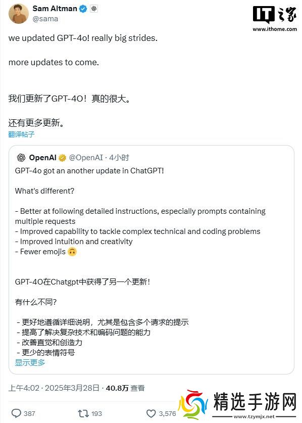 OpenAI 首席执行官萨姆奥尔特曼(Sam Altman)则表示,本次更新的改进非常实质性,并且很快会有更多更新推出。